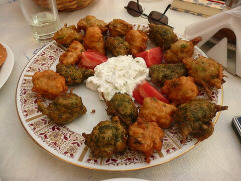 Eine besondere Spezialität haben im kleinen Bergdorf Vourliotes kosten dürfen. Fritittierte Bällchen aus Kichererbsen und Spinat. Dazu eine Portion Tzatziki .... Einfach nur lecker.